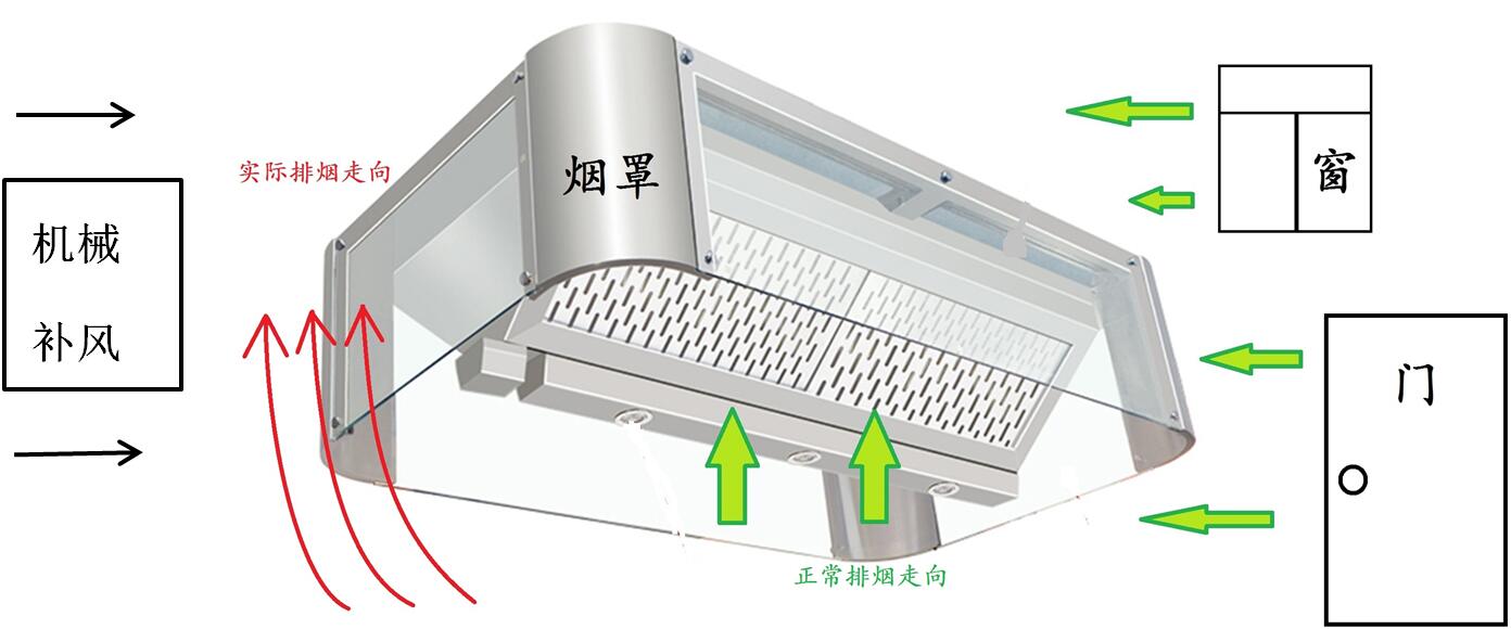 风柜开启后,厨房会产生负压,气流会通过机械补风和自然补风流向厨房。准确的说:空气会从门窗位置流向烟罩方向,因为自然补风系数较大、流量多,会造成流速过快,与烟罩排烟正常吸捕范围内的上升气流形成对冲,造成气流上升方向改变、倾斜,导致烟气外溢,排烟效果不理想。