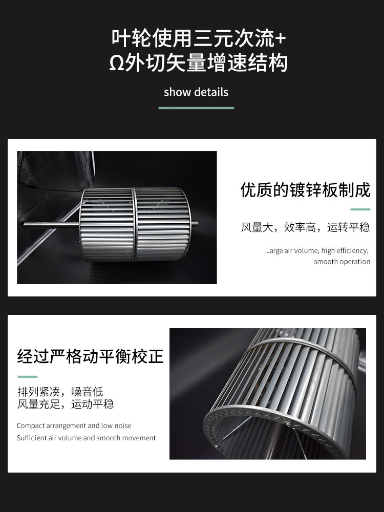 【叶 轮】使用三元次流+Ω外切矢量增速结构,风量大、动力强、节能高效;