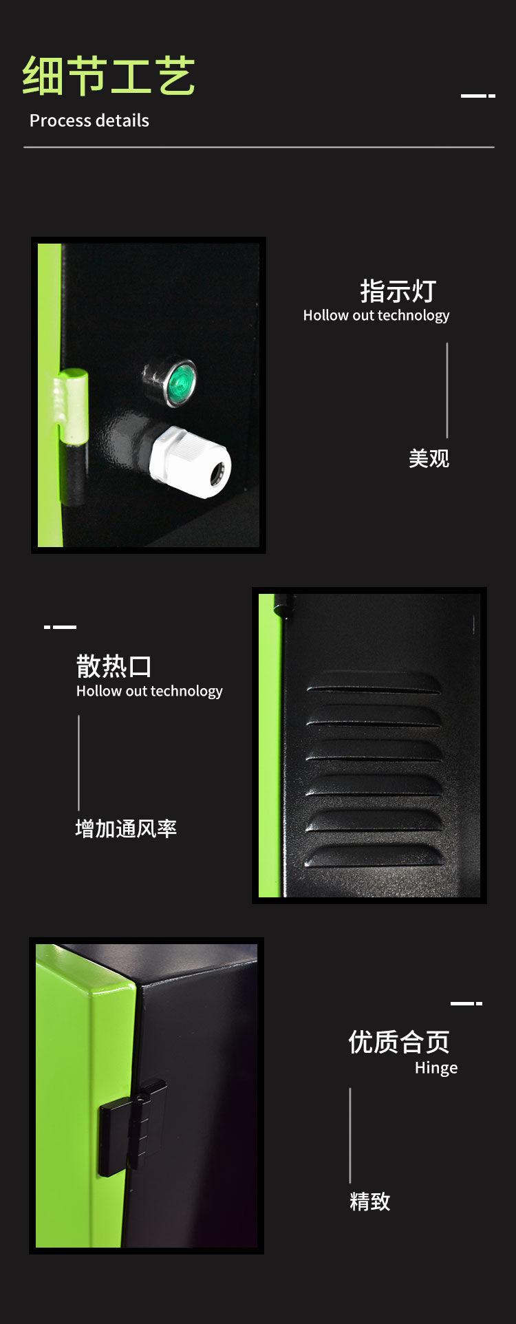 外壳采用1.5mm冷轧板;采用静电喷塑工艺,美观大方有质感;不锈钢框架,细节中体现极致工艺。